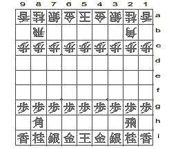 У каждой стороны есть один король, одна ладья, один слон, два золотых генерала, два серебряных генерала, два коня, два копья и девять пешек. В крайнем ряду, рядом с копьями располагаются кони. Рядом с конями – серебряные генералы. Рядом с серебряными генералами – золотые генералы. В центре, между двумя золотыми генералами находится король. На втором ряду – только две фигуры. Перед конем с левой стороны находится слон. Перед конем с правой стороны – ладья. В третьем ряду расположены девять пешек.