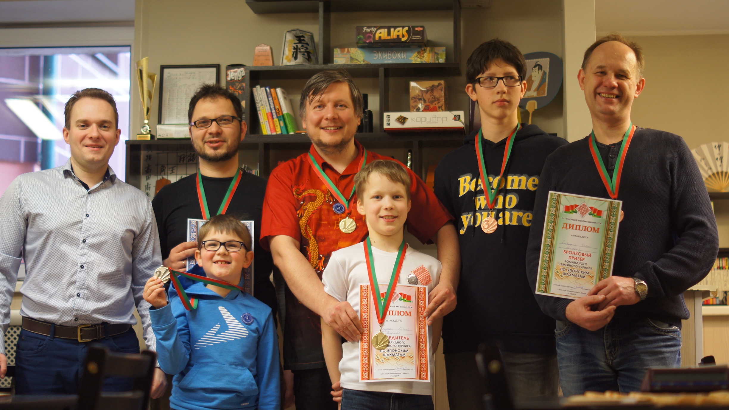 9 команд приняли участие в весеннем семейном командном турнире, что прошел 21 апреля в сёги-клубе «Гинкаммури». Команда – это пара «ребенок + взрослый»; в поединке пар ребенок играл с ребенком, взрослый – со взрослым.